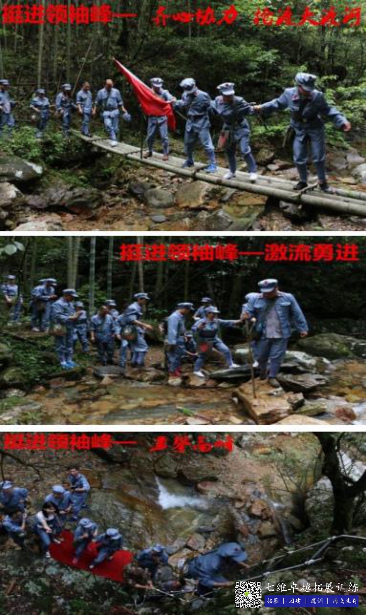 互幫互助,安全快速的, 集體通過湍急的溪流。學員(yuán)加深感情的良好時機。