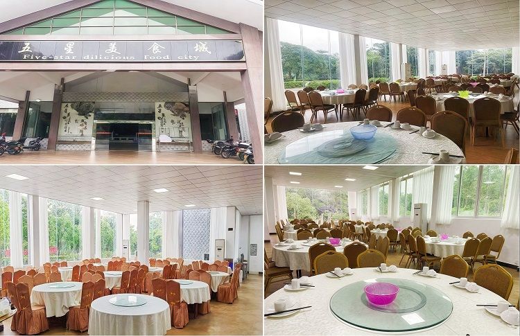 萬裏山影度假村園區內有可容納1000人同時就(jiù)餐的農家風味美食城-五星美食城(chéng)。招(zhāo)牌菜品(pǐn)有風生水起五(wǔ)星撈(lāo)雞(jī),魚魚得水等。菜式分多款標準,也可以(yǐ)根據(jù)您的(de)需求量身定做餐標等(děng)