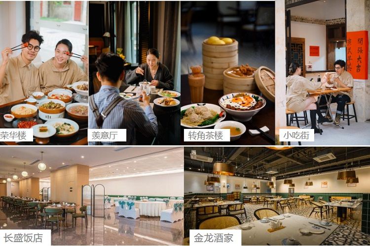 早茶客、長盛(shèng)飯店、美堂羨意廳、 南圜餐廳、金龍酒家、老(lǎo)石爐披薩 店、榮(róng)華樓、威靈頓(dùn)咖啡廳、花神 西餅屋、新記奶茶店(diàn)、轉角茶樓、 楓裏堂涼茶(chá)鋪、