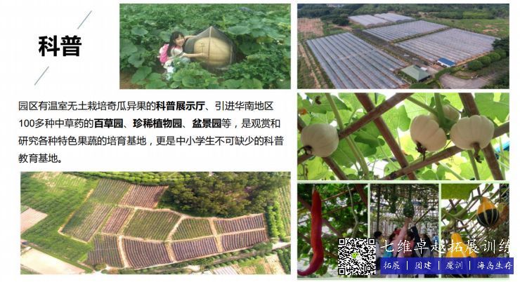 園區有溫室無土栽培奇瓜異果的科普展示廳、引進華南地區100多(duō)種中草藥的百草園、珍稀植物園、盆景園等,是觀(guān)賞和研究各種特色果蔬的(de)培(péi)育(yù)基地,更(gèng)是中小學(xué)生(shēng)不可缺少(shǎo)的科普教育基地。