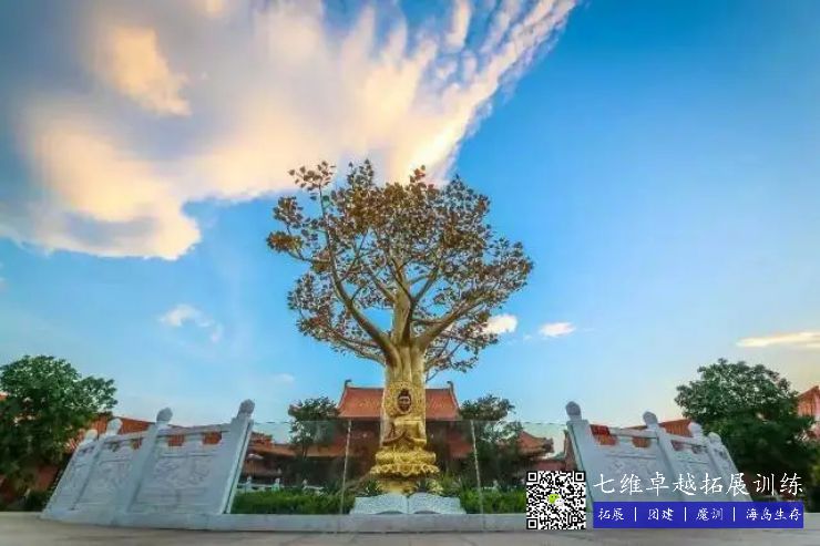 全球首座戶外仿金銅鑄金菩提聖樹,樹高13.7米,4800 片(piàn)金葉子,運用18噸仿(fǎng)金銅鑄造而成,取意釋迦牟尼菩提樹下悟道成佛典故。