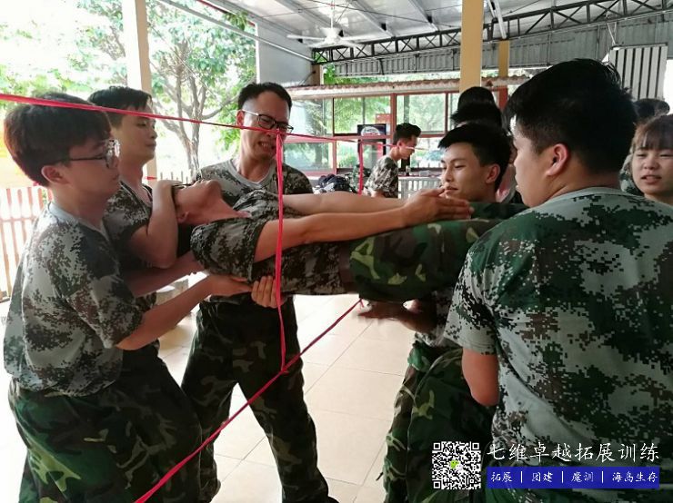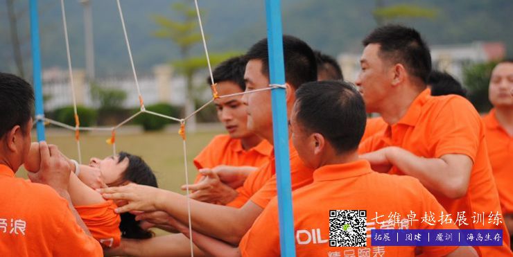 蛟龍出海是一個(gè)團(tuán)隊配合的項目(mù),全隊(duì)的夥伴用綁腿繩將腳連在一塊,橫向一排。通過側行和前行規定的路線,在盡量少的時間內從(cóng)起點到達重點(diǎn)。在這個(gè)項目中,團隊配合是至(zhì)關重要的,如何調整自己與團隊(duì)的步伐,稱為團隊(duì)成功的(de)關鍵。