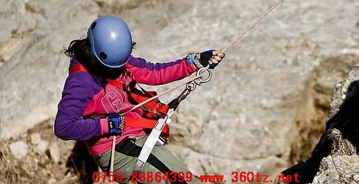 安全帶:速降時使用的是坐式安全帶,由腰帶和綁在兩側大腿根(gēn)的腿帶構(gòu)成。穿戴時要注意調整好鬆(sōng)緊,不(bú)然在長時間的(de)下降過程中(zhōng)會很不舒服。另外,係安全帶(dài)時切記打反扣,即帶子係好後沿反方向穿回,以防途中帶子鬆開脫落。