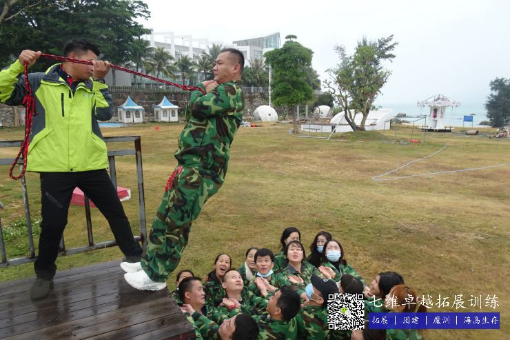 這個項(xiàng)目的(de)要點就是要“信任彼此,信任團隊(duì)”。 規則是每個人都必須站在一(yī)個1.6米的高台上,手被捆住(zhù),下麵的隊員用自己的胳膊搭起堅(jiān)強的後盾,站在隊友倒下的方向,每一位隊員輪流站在高高的背摔台 上,背對(duì)著大家,都要喊一聲“ 準(zhǔn)備好了嗎”,回答均是整齊嘹(liáo)亮的(de)“準備好了!”,然(rán)後後仰,落入(rù)下(xià)麵的夥伴組建的臂床(chuáng)上(shàng)。對台(tái)上背摔的人而言,由於看不到背 後的(de)情(qíng)況(kuàng)而產生“我摔下去會不會受傷”的焦慮,此時能否調整自己的心態,相信同伴的(de)力(lì)量,果斷、勇敢地向後倒下去,是取得(dé)成功(gōng)的關鍵。