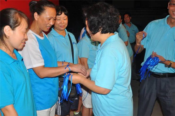 現在請(qǐng)我們(men)所有的夥伴互相(xiàng)走動走來,把你握(wò)在(zài)手中的藍絲帶獻給你的(de)朋友,你的同(tóng)事,你的領導,伴隨著這首(shǒu)歌—把愛傳出去