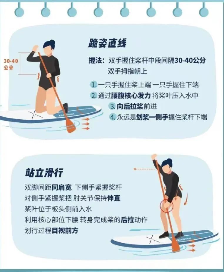 學習劃槳的方法,在板上站立的位置,避免下水後產生(shēng)的過激反應。