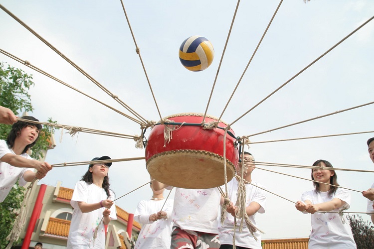 擊鼓顛球又叫動感顛球、鼓動心聲、鼓動人心(xīn),這是一個要(yào)求團隊高度協作的項(xiàng)目,需要大家在短時間內製定出達到目標的方案,並在(zài)執行(háng)過程中協調(diào)一(yī)致。